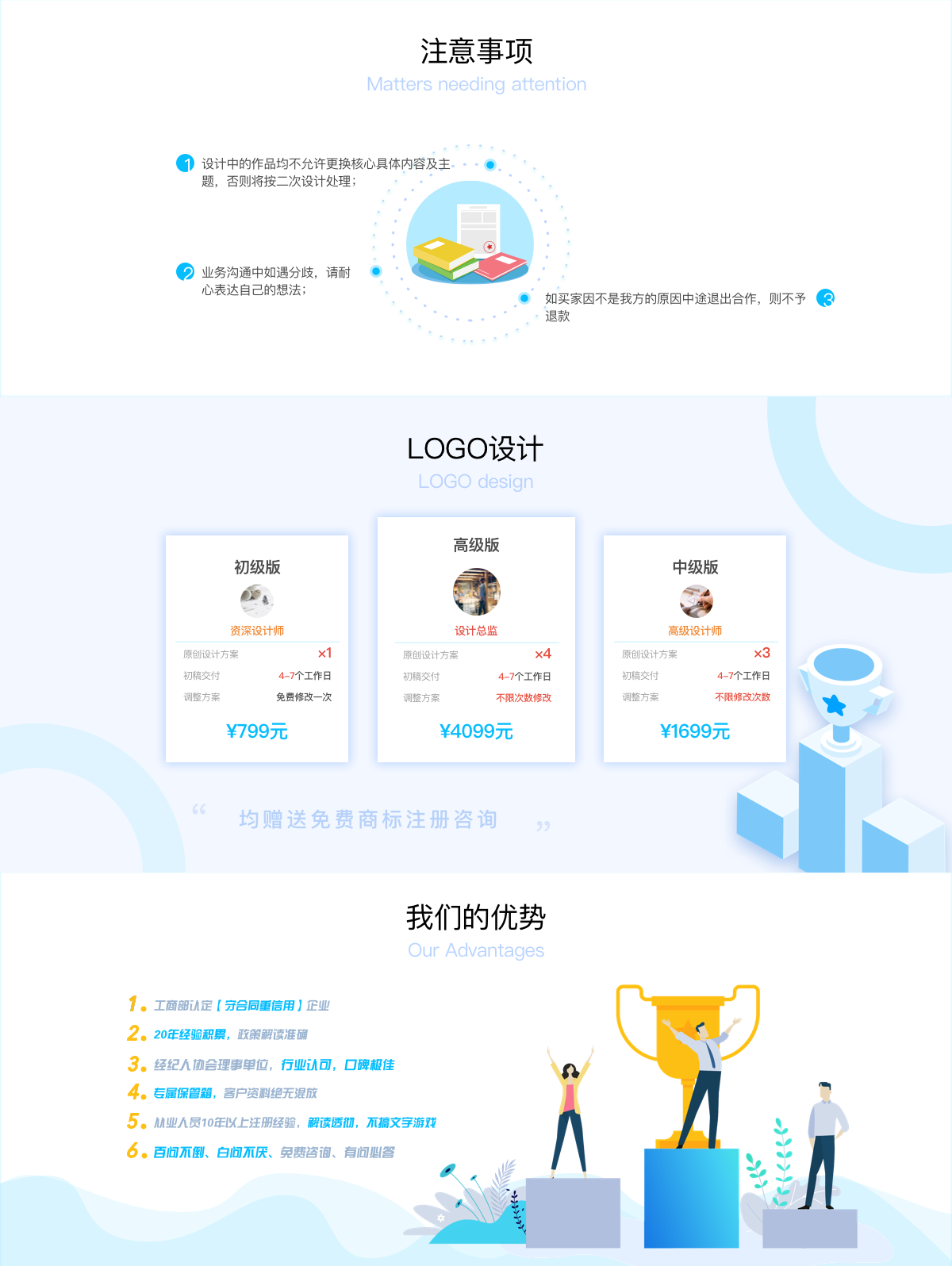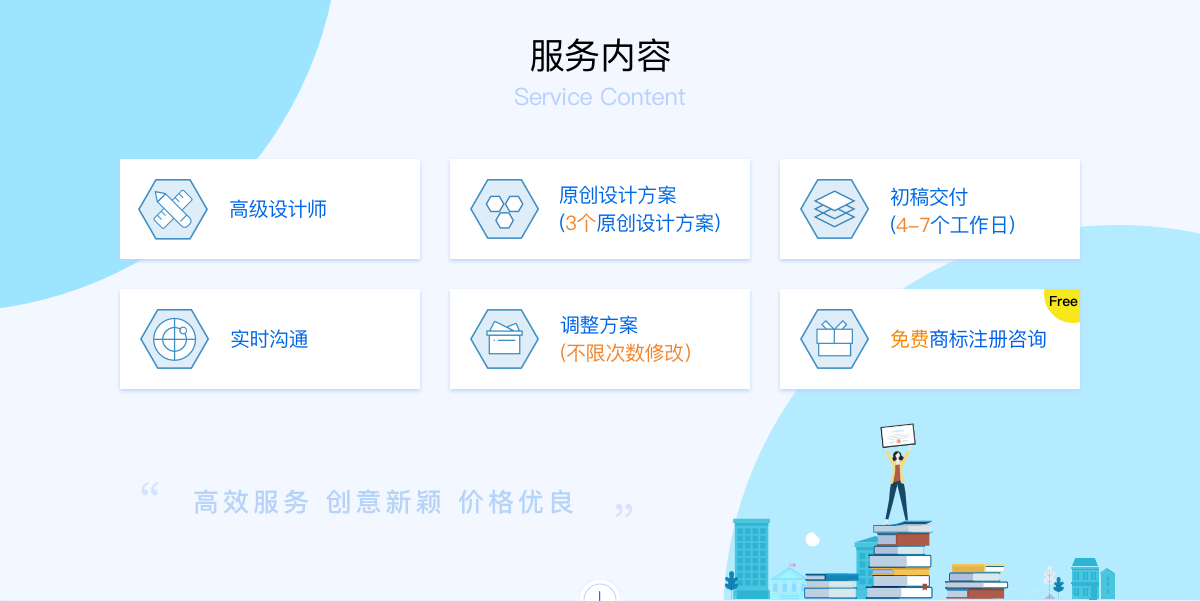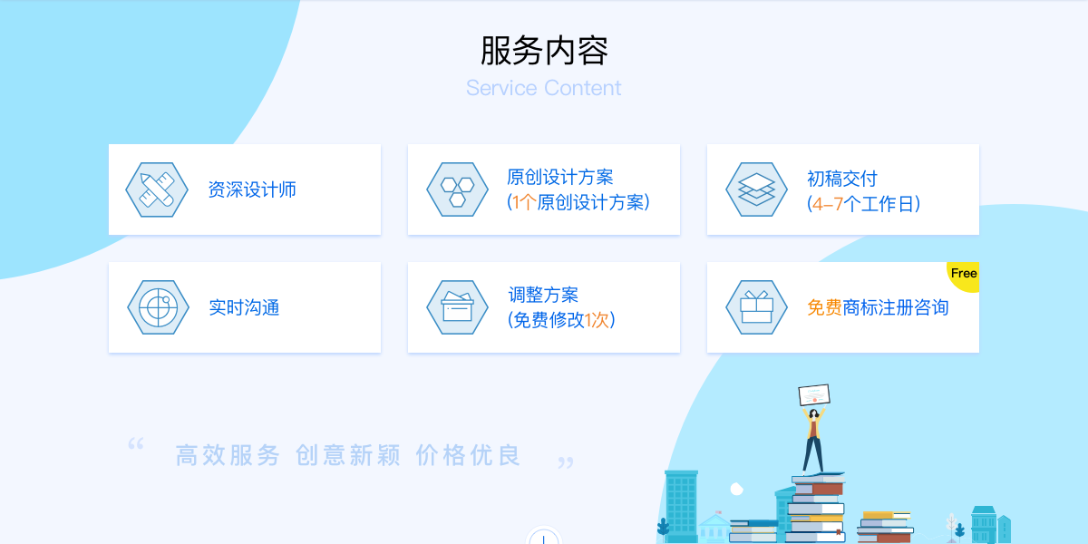 高級設(shè)計師+原創(chuàng)設(shè)計方案(三個原創(chuàng)設(shè)計方案)+初稿交付(4-7個工作日)+調(diào)整方案(不限修改次數(shù))+實時溝通+免費商標(biāo)注冊咨詢